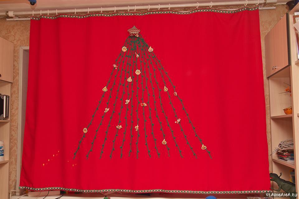 Описание изображения: | штора новогодняя. отделка тесьмой с новогодним принтом. елка из тесьмы, вязанной крючком. |